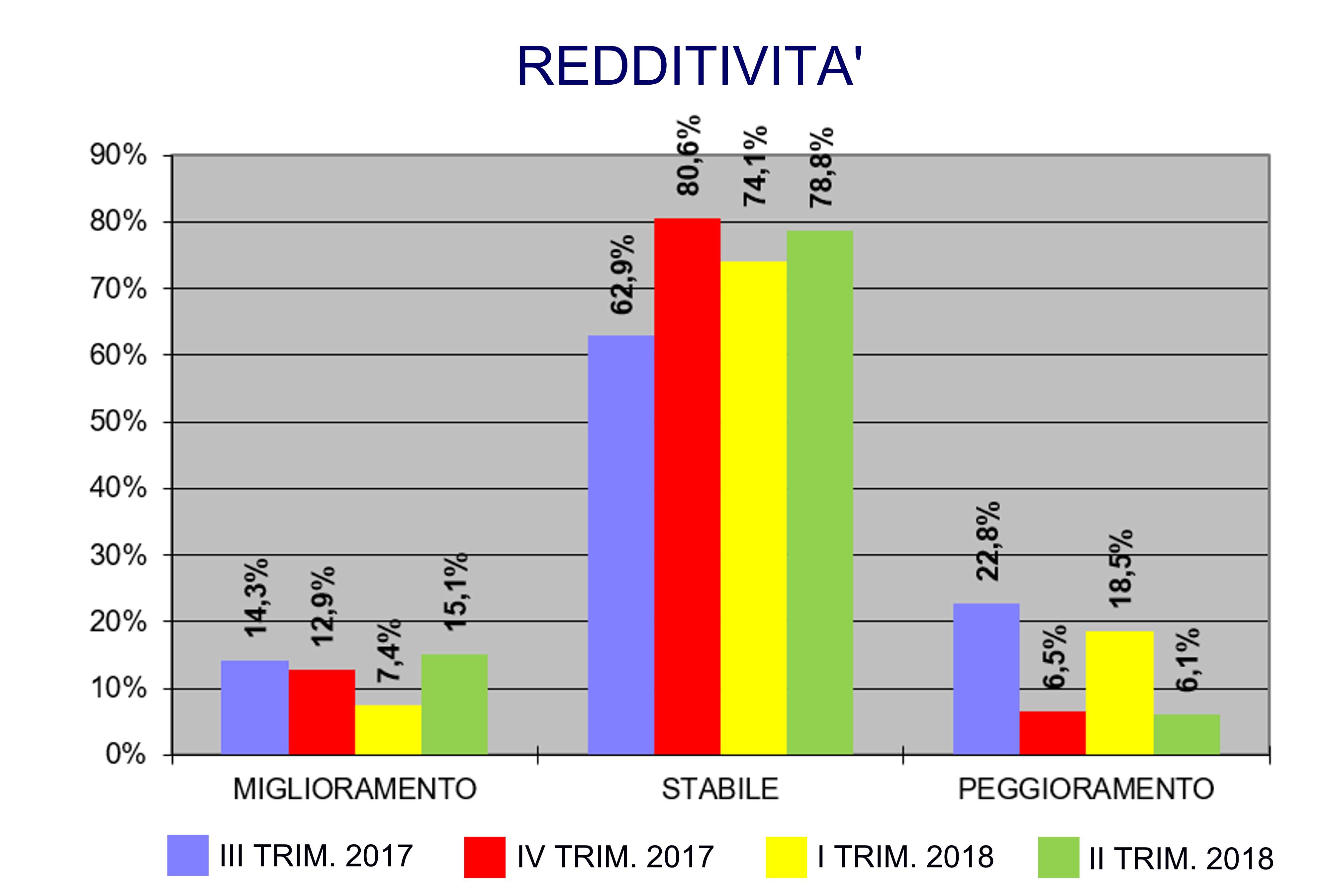 Dopo un trimestre negativo, torna positivo il dato relativo alla redditività delle aziende intervistate: infatti, nel secondo trimestre 2018 il saldo ottimisti-pessimisti presenta nuovamente un segno positivo (+9, a fronte di -11,1 registrato nel primo trimestre 2018); in dettaglio, il 15,1% degli interpellati prevede un miglioramento della propria redditività, a fronte solamente di un 6,1% che ne prevede un’ulteriore diminuzione.