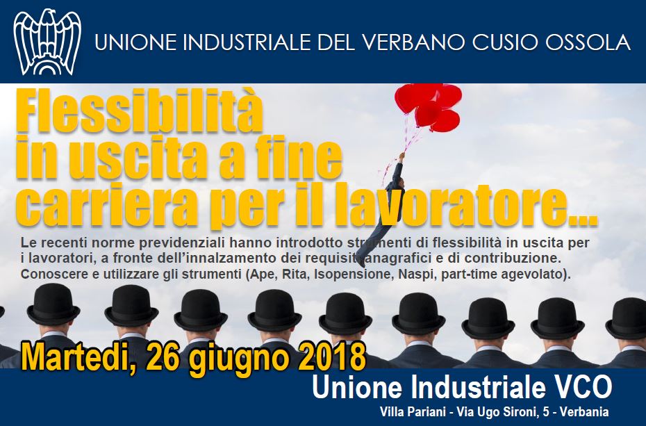Si terrà domani martedi 26 giugno 2018 alle ore 14,00 – a Villa Pariani – il convegno organizzato da Unione Industriale del VCO dal titolo "Flessibilità in uscita a fine carriera per il lavoratore".