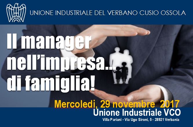Il prossimo Mercoledi 29 novembre dalle ore 14,30 si terrà nella sede dell’Unione Industriale del Verbano Cusio Ossola un convegno aperto alle imprese e ai professionisti di settore sulle dinamiche aziendali relative alla transizione generazionale. La proposta dell’Unione Industriale VCO - con la partecipazione di Federmanager e Fideuram gruppo Intesa San Paolo - evidenzia già nel titolo “Il Manager nell’Impresa…. di Famiglia” l'intenzione di promuovere un approfondimento tematico e di fornire un utile contributo alle imprese del nostro territorio, in termini di esperienze e competenze sul passaggio generazionale nelle realtà aziendali caratterizzate da rapporti familiari.